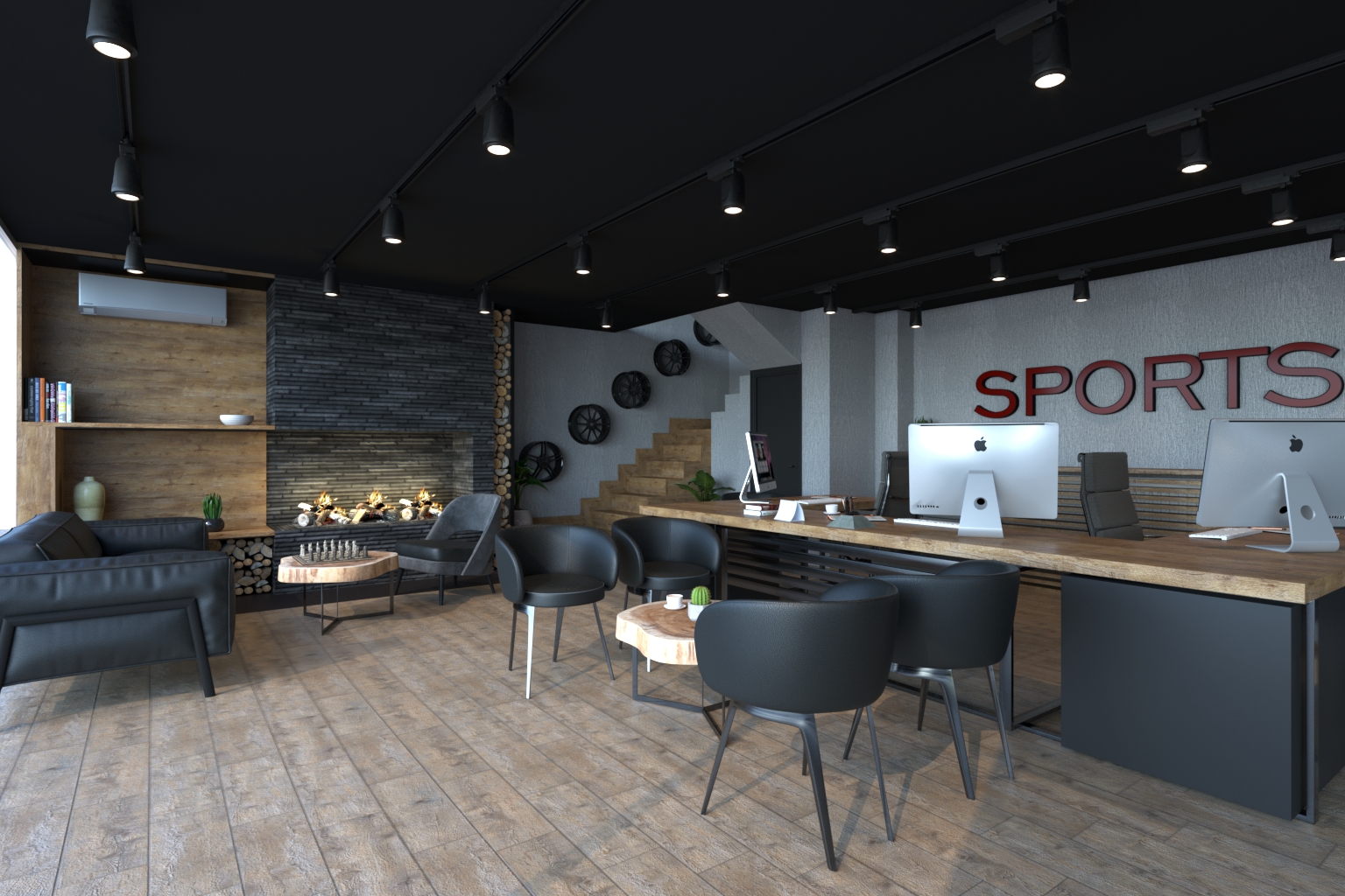 Galeri Sports showroom ofisi, kullanıcı deneyimini önceliklendiren ve markanın güçlü kimliğini destekleyen bir iç mekân tasarımıyla hayata geçirildi. Girişte yer alan araç sergileme alanı ile ofis fonksiyonları aynı hacimde birleştirilirken, mekânın genelinde kullanılan doğal ahşap yüzeyler, antrasit tonlar ve mat dokularla modern ve kararlı bir duruş elde edildi. Tavanda kullanılan siyah yüzey, mekânı görsel olarak alçaltarak daha yoğun bir atmosfer yaratırken; ray spot aydınlatmalarla ürünler ve işlevsel alanlar dramatik biçimde vurgulandı. Bekleme alanında konumlandırılan şömine detayı, mekâna sıcaklık katarken müşteri ile kurulan ilişkiyi daha samimi bir hale getiriyor. Sergileme alanı, oturma düzeni ve çalışma birimleri arasında kurulan açık akış; hem ekip içi etkileşimi hem de ziyaretçi deneyimini optimize edecek şekilde kurgulandı.