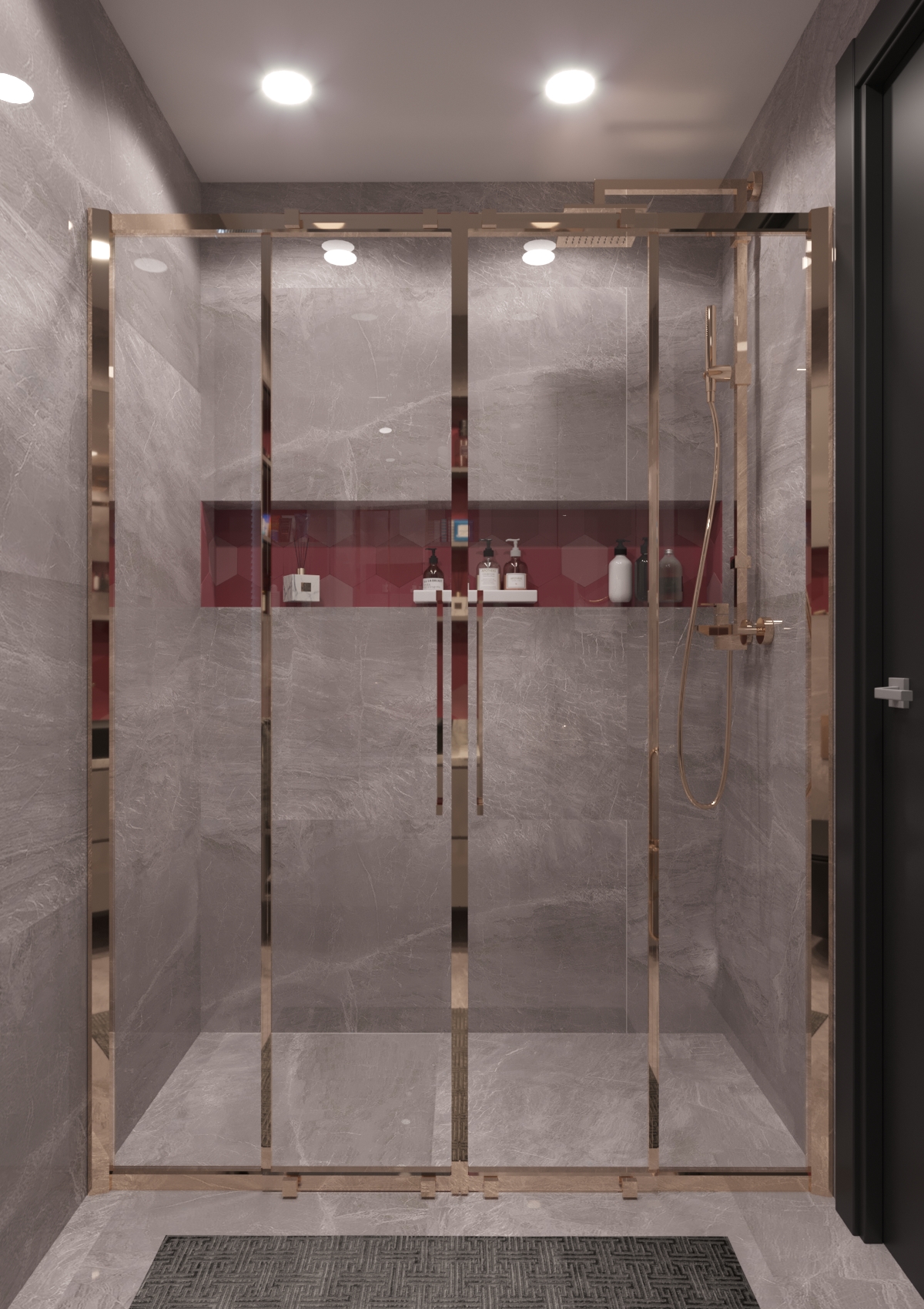 Dora Park projesinde yer alan iç mekânlar, kullanıcı ihtiyaçlarına göre kişiselleştirilmiş alanlar sunuyor. Ebeveyn banyosunda, canlı pembe altıgen seramikler ve mat yüzeylerle kontrast bir tasarım dili oluşturulurken; altın tonlu armatür detayları ve entegre aydınlatmalar ile modern bir şıklık sağlandı. Bu alan hem cesur hem de kullanıcıya ait bir karakter taşıyor. Genel banyoda ise açık mermer dokular, nötr tonlar ve yumuşak aydınlatmalarla ferahlatıcı bir atmosfer yaratıldı. Çift lavabo kullanımı ve geniş saklama alanları, işlevselliği ön plana çıkarıyor. Yatak odasında pastel tonlar, dokulu duvar kağıtları ve entegre makyaj alanıyla birlikte zarif ve huzurlu bir yaşam alanı kurgulandı. Pembe detaylar, altın rengi aplikler ve dokunsal yüzeyler bu alana sıcaklık katıyor.